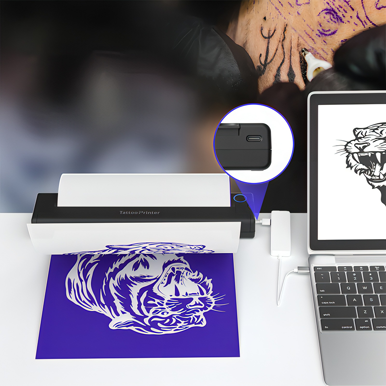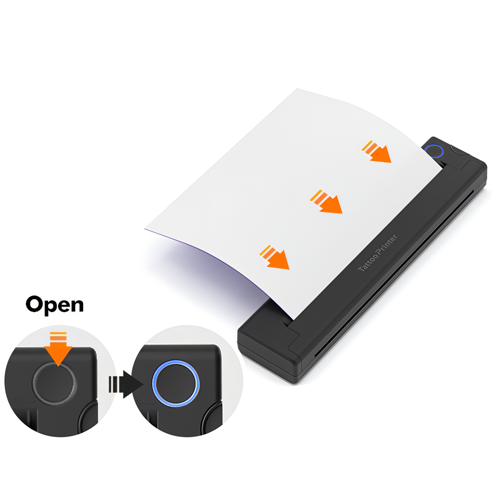 Turn on the printer, insert the white transfer paper and ink page, ensuring the white transfer paper is facing up.